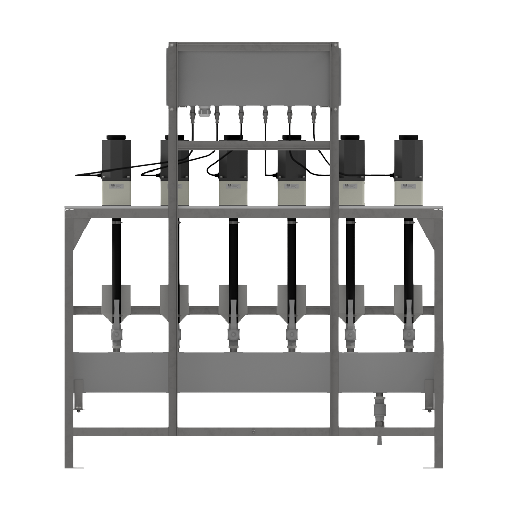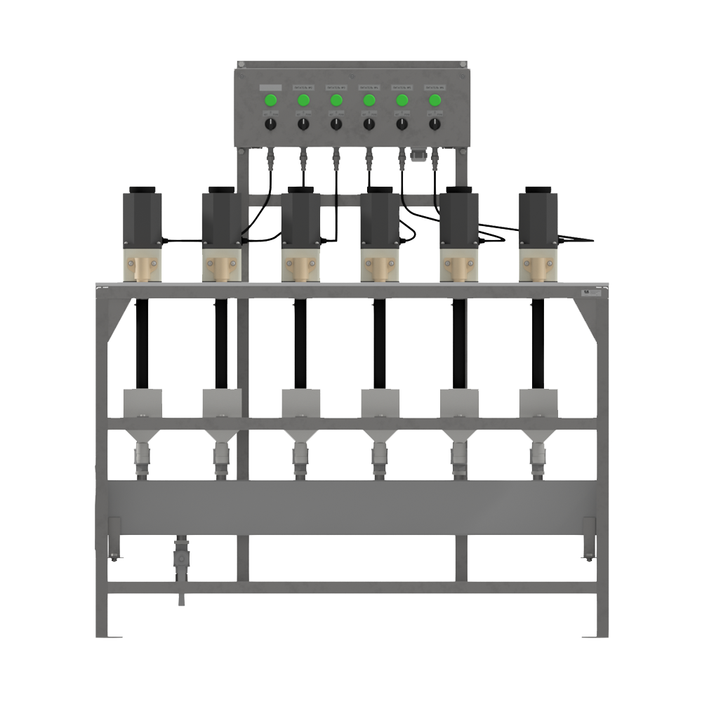 Установка состоит из металлической рамы, на которой установлен пульт управления и закреплена столешница. Под столешницей закреплен коллектор с шаровыми кранами и установлены шесть воронок. На пульте управления установлены индикаторы включения питателей реагентов, переключатели режима работы (Авт. – 0 – Ручн.) и разъемы с байонетным зажимом для подключения питателей реагентов. Коллектор с двух сторон заканчивается присоединительными фланцами для подсоединения реагентопровода, идущего от бака, или промывочной воды. В верхней части коллектора установлены шесть шаровых кранов с ниппелями для подсоединения шлангов, идущих к питателям реагентов. Снизу коллектора находится ниппель слива промывочной воды с шаровым краном.