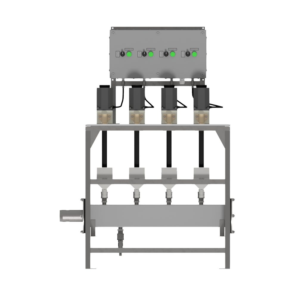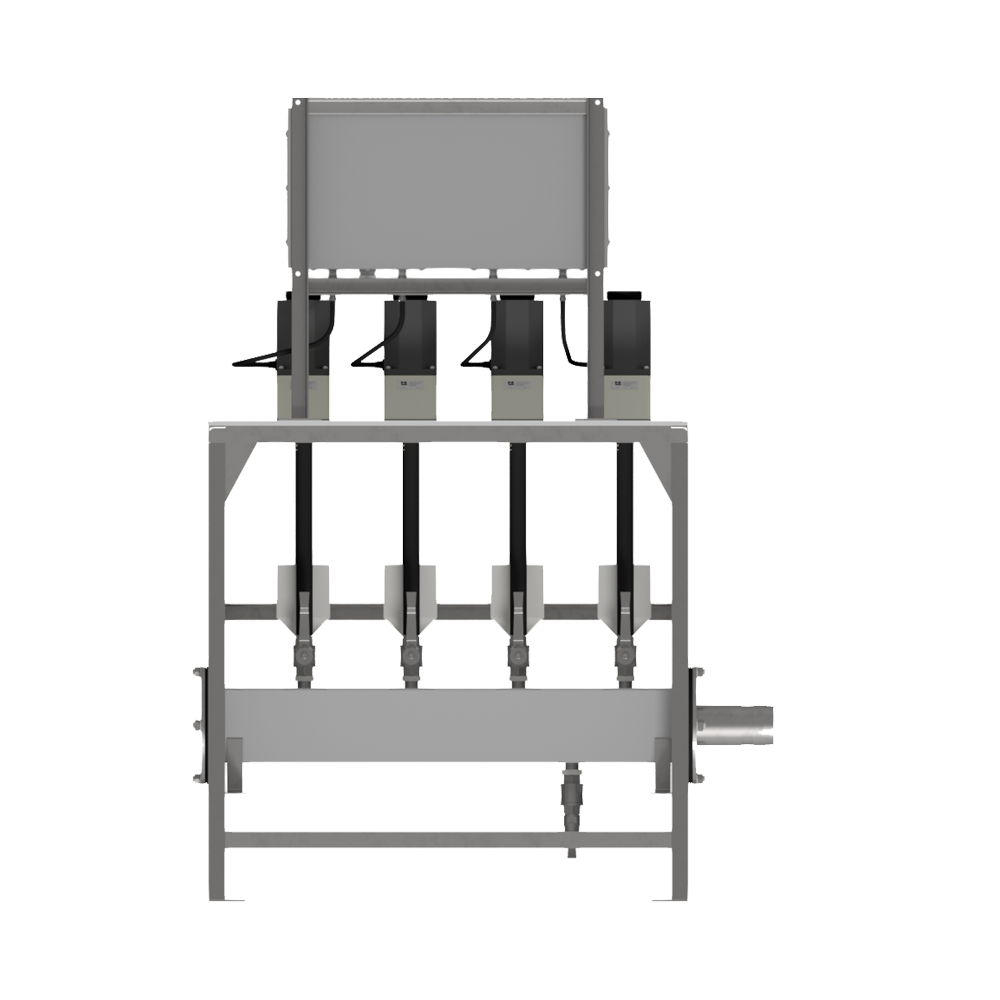 Установка состоит из металлической рамы, на которой установлен пульт управления и закреплена столешница. Под столешницей закреплен коллектор с шаровыми кранами и установлены четыре воронки. На пульте управления установлены индикаторы включения питателей реагентов, переключатели режима работы (Авт. – 0 – Ручн.) и разъемы с байонетным зажимом для подключения питателей реагентов. Коллектор с двух сторон заканчивается присоединительными фланцами для подсоединения реагентопровода, идущего от бака, или промывочной воды. В верхней части коллектора установлены четыре шаровых крана с ниппелями для подсоединения шлангов, идущих к питателям реагентов. Снизу коллектора находится ниппель слива промывочной воды с шаровым краном.