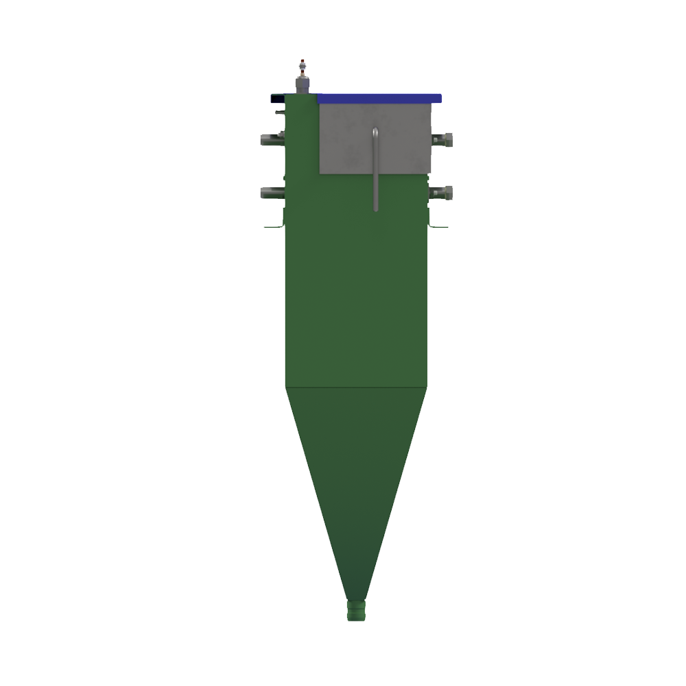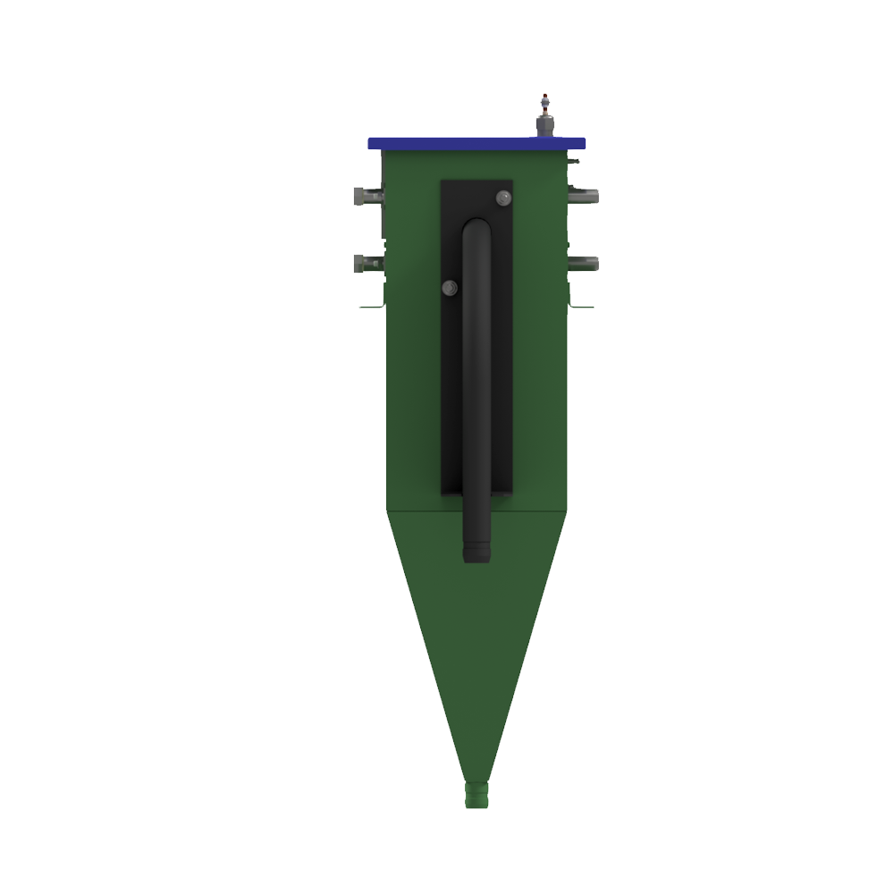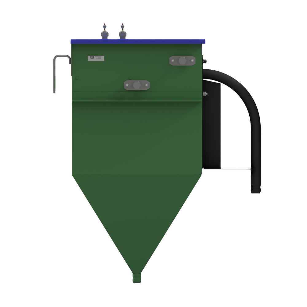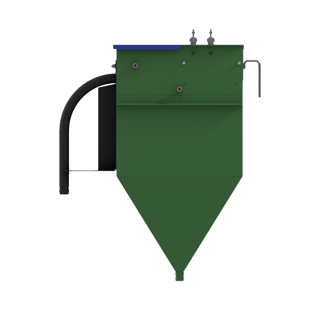 Бак состоит из металлического корпуса, в нижней части которого расположен выходной штуцер. Внутри корпуса размещена фильтрующая сетка, датчики уровня и форсунки промывки/пеногашения, На торце установлен кронштейн с отводом.