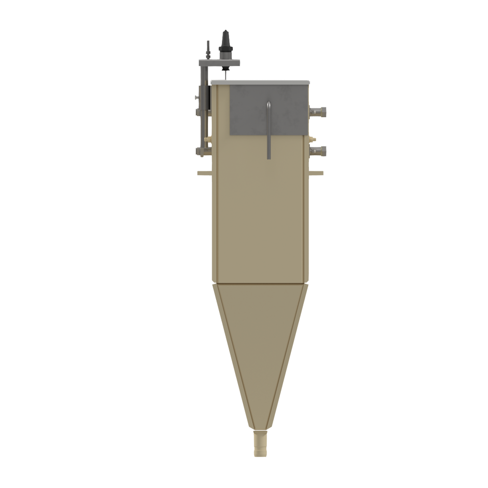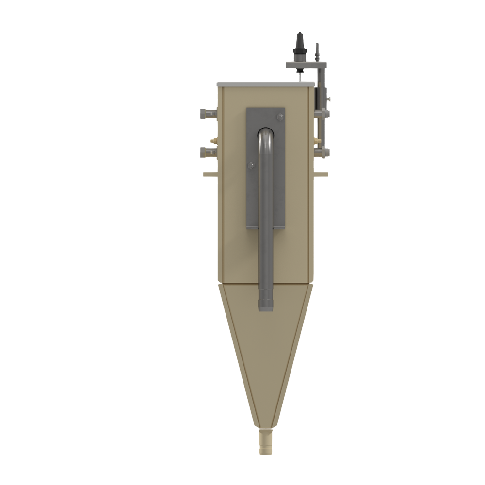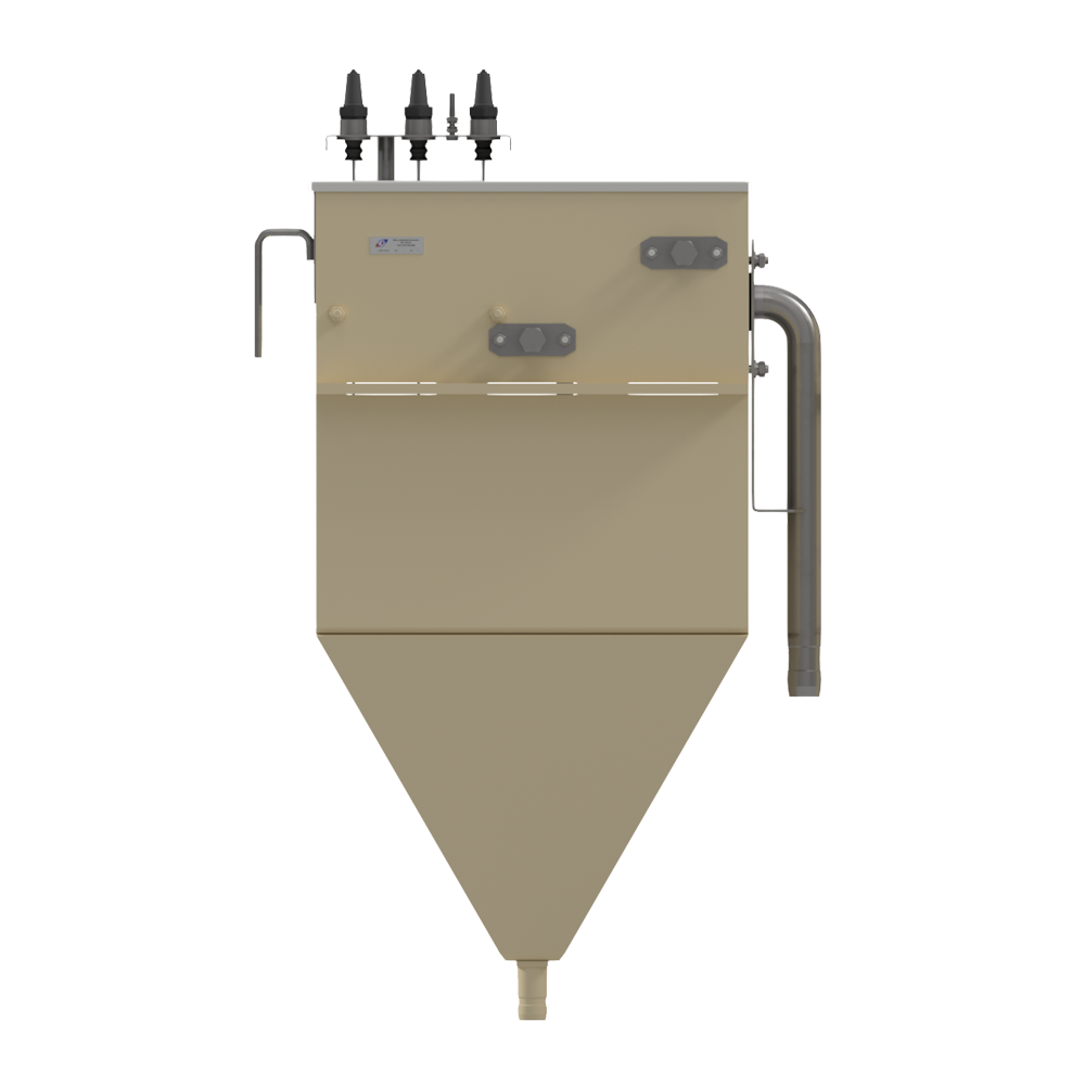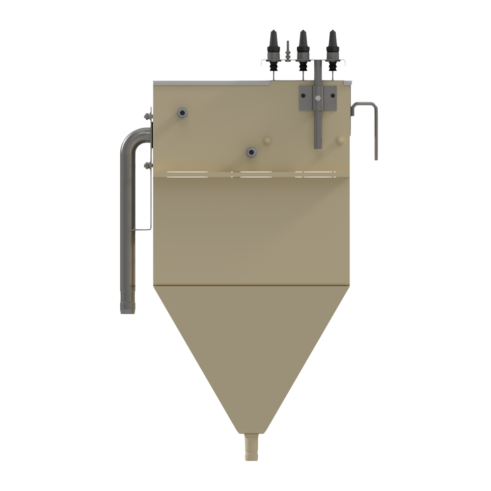 Бак состоит из пластикового корпуса, в нижней части которого расположен выходной штуцер. Внутри корпуса размещена фильтрующая сетка, датчики уровня и форсунки промывки/пеногашения, На торце установлен кронштейн с отводом.